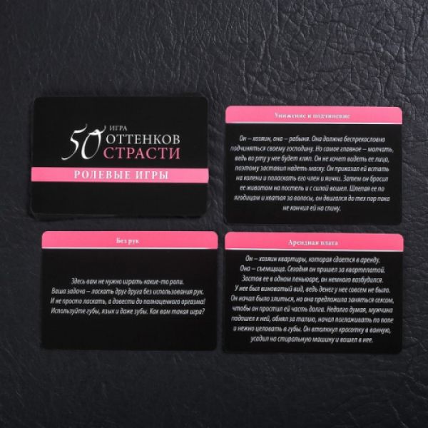 Вас ждёт 10 карточек, на каждой из которых — сценарий ролевой игры. Он не прописан от А до Я, вам нужно будет фантазировать. В некоторых ролевых играх используются кляп и маска. Вы можете добавить и другие атрибуты для полноты образа.