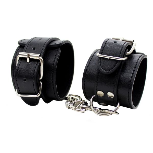 2. Черные наручники надежно фиксируются пряжками и ремнями, позволяющими выбрать нужный размер, цепочка с карабином фиксирует наручники вместе.