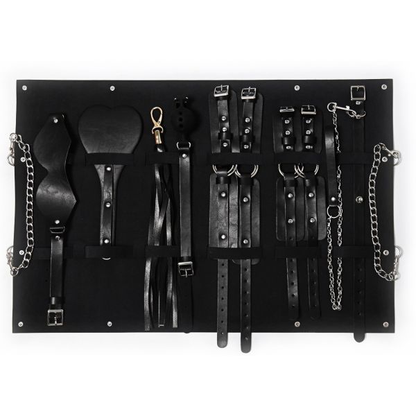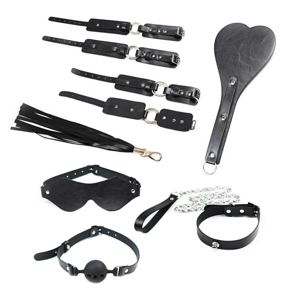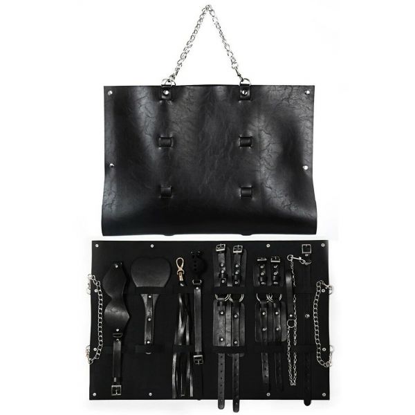 В набор входят: сумка для хранения, наручники, поножи, пэдл, плеть, маска на глаза, ошейник c поводком и кляп-шар.