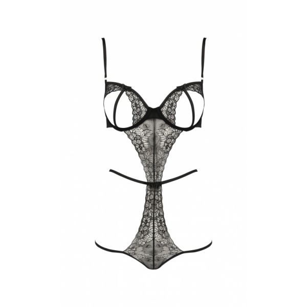 Соблазнительное боди Esmeralda черного цвета выполнено из эластичного кружева и стреп-лент.