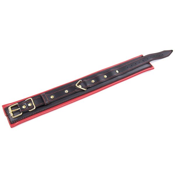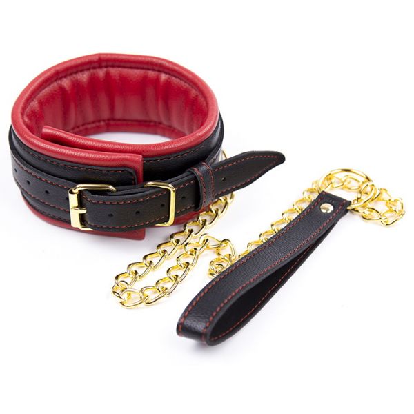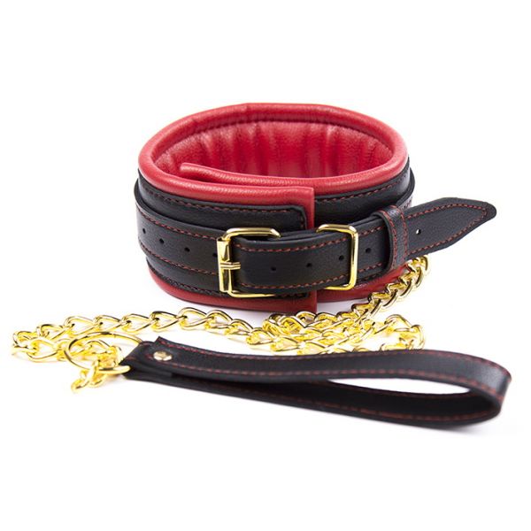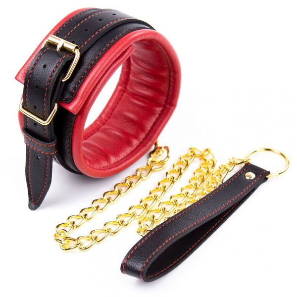 Черно-красный ошейник с поводком на золотой цепи
