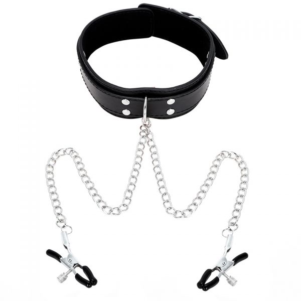 Черный ошейник выполнен из кожи и украшен заклепками. На двух цепях, отходящих от него, есть зажимы для сосков.