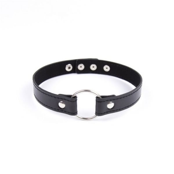 Оригинальный черный ошейник, декорированный металлическим кольцом. Крепление в виде заклепок.