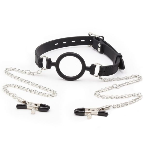Черный силиконовый кляп-кольцо с зажимами для сосков