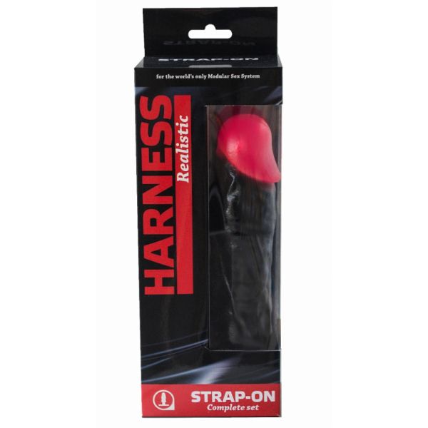 Страпон Harness Realistic вызывает настоящий шок своим видом – угольно-черная насадка с алой головкой выглядит невероятно возбуждающе.
