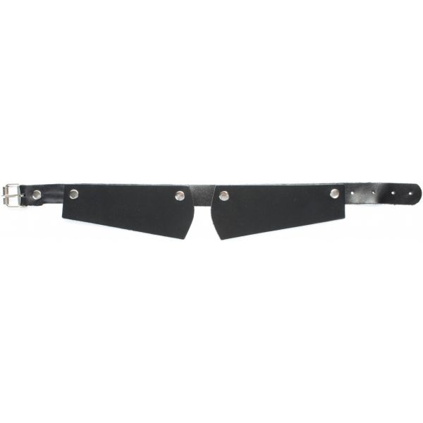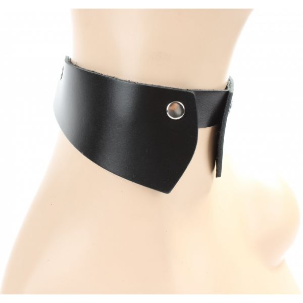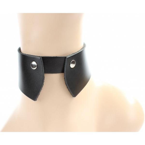 Чокер выполнен из натуральный черной гладкой кожи. Форма аксессуар напоминает воротничок.