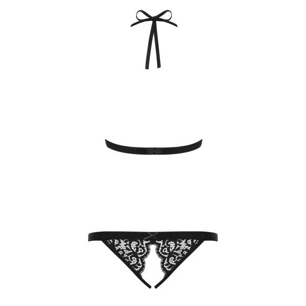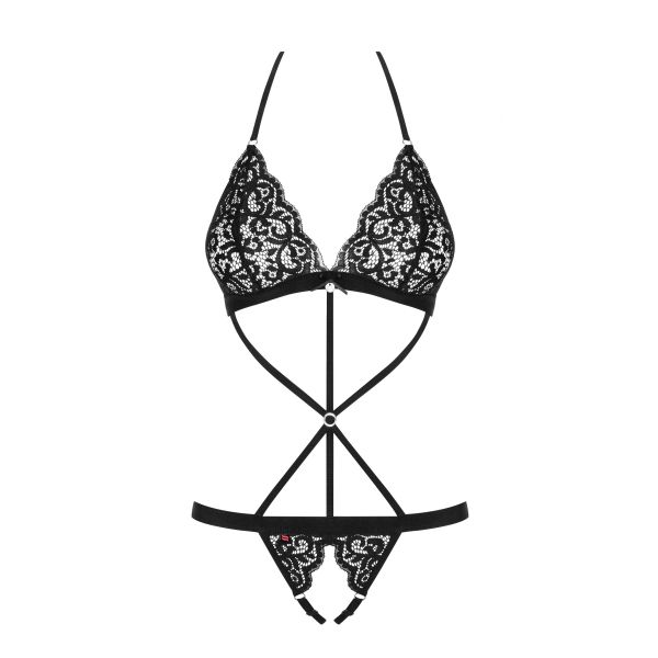 Детали: пикантное боди из черного кружева и эластичных лент, сочетание бюстгальтера и трусиков, сексуальная шнуровка на шее (открытая спина!), многоступенчатая застежка - идеальная посадка, открытая промежность, украшения в виде блестящих круглых элементов и бантов, эластичная ткань, адаптирующаяся к телу.
