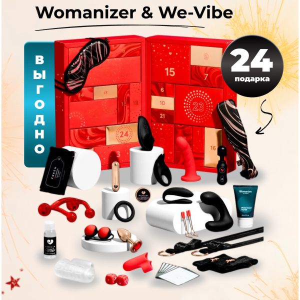 Календарь включает в себя флагманские продукты: знаменитый вакуумный стимулятор от Womanizer, а также вибратор для пар We-Vibe - незаменимый для тех, кто желает познакомиться с более ярким интимным опытом в паре.