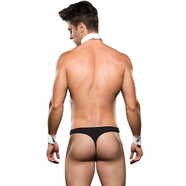 На самом деле... от рубашки остались только элегантный воротник и манжеты для запястий. А из штанов... сексуальные мужские стринги, демонстрирующие ягодицы в полной красе.