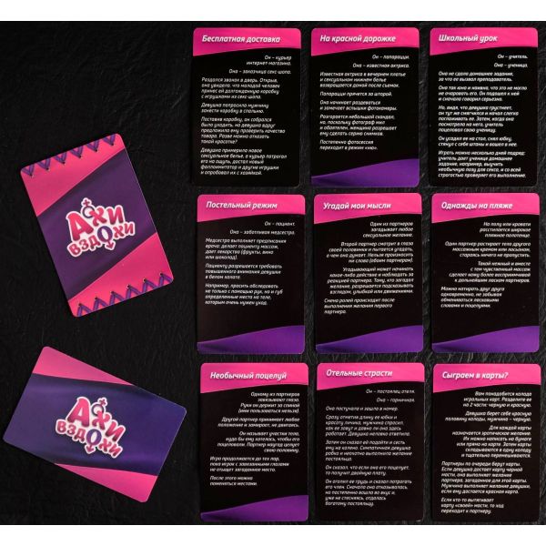 Внутри вас ждёт 10 карточек с фантами, а именно — с вариантами ролевых игр.