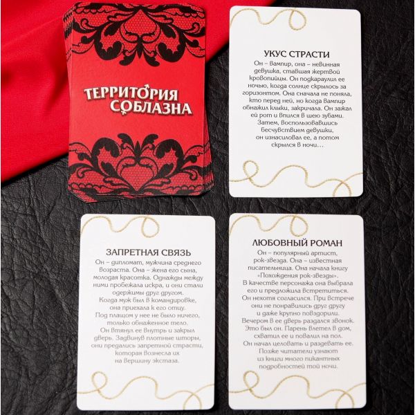Внутри вас ждут 10 карточек с горячими сценариями ролевых игр. Изучите карточки, выберите подходящие и воплотите написанное в жизнь. Партнёрша может использовать кошачьи ушки и мягкую галстук-бабочку, чтобы добавить образу перчинки.