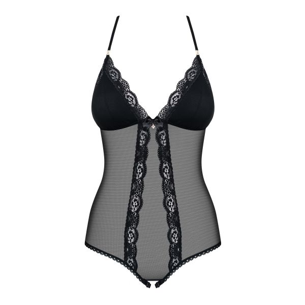 Детали: пикантное боди из прозрачной сетки и украшающего тело кружева, регулируемые бретельки, перекрещенные на спине - для идеальной посадки и сексуального образа, мягкие чашки - слегка приподнятая, красиво подчеркнутая грудь, ювелирные вставки, игривые бантики - спереди и ... над обнаженными ягодицами, открытая промежность с регулируемыми бретелями, приятные на ощупь, эластичные и идеально облегающие ткани.