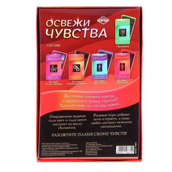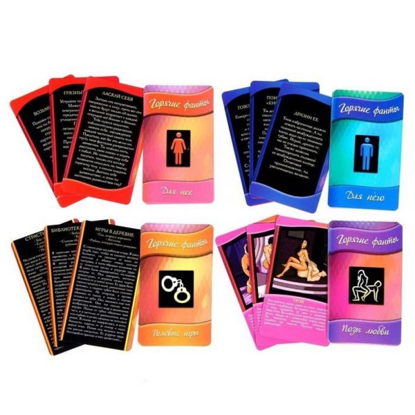 В карточках "Для неё" вы найдёте задания, способные до предела возбудить желание партнера. Колода "Для него" таит в себе секреты наслаждения для партнерши. Карты "Позы любви" — это невероятные описания сексуальных позиций, сопровождающиеся откровенными иллюстрациями. А на сладкое мы приготовили колоду "Ролевые игры" — с ней вы подарите друг другу новые эмоции и ощущения.