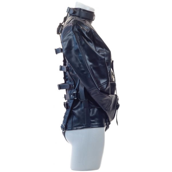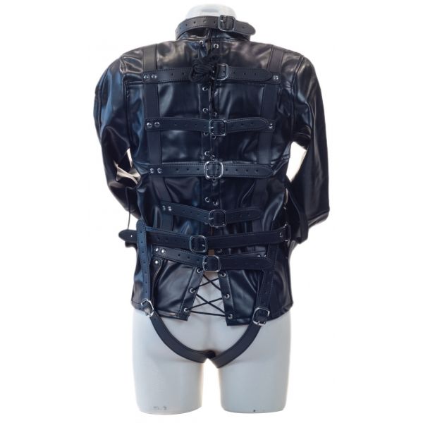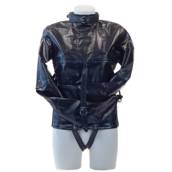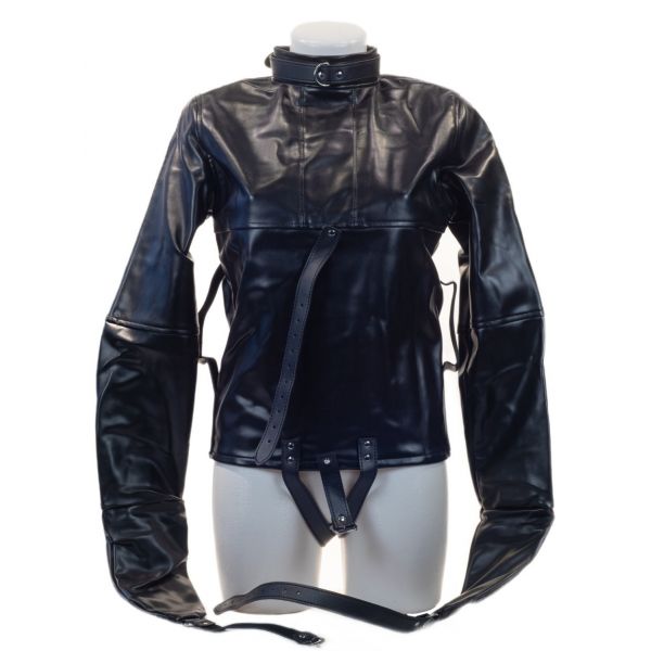 Смирительный жакет, основная часть которого выполнена из кожзаменителя, предназначен для надежной и удобной фиксации рук подчиняющегося партнера!