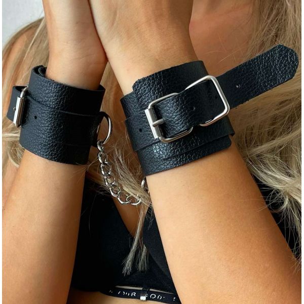 Металлическая фурнитура обеспечивает качественную фиксацию. Наручники соединяются между собой двумя карабинами, благодаря чему обеспечивается достаточно жесткая сцепка.
