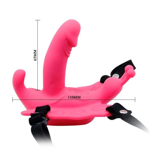 Бабочка имеет изогнутый вагинальный отросток, который простимулирует точку G, а усики бабочки подарят двойное удовольствие, лаская чувствительный клитор разнообразнейшими 10 функциями вибрации. Носить бабочку очень просто, одевается она на бедра с помощью регулируемых эластичных ремешков.