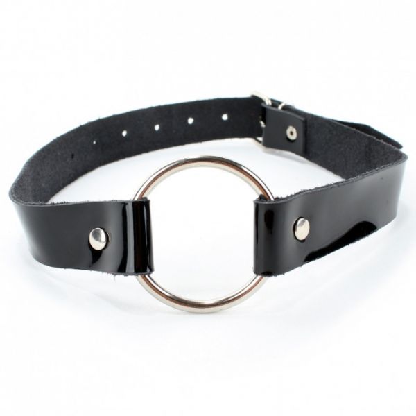 Кляп в виде открытого кольца на ремешке, изготовленном из натуральной лакированной кожи черного цвета (ширина ремня - 2 см).