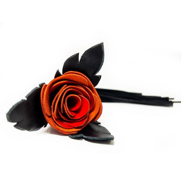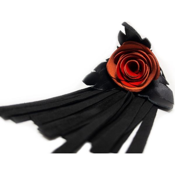 Цветок полностью выполнен из натуральной лаковой кожи, листочки розы и рукоятка выполнены из мягкой натуральной кожи, а хвосты плети - из натуральной мягкой замши.