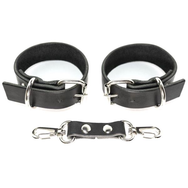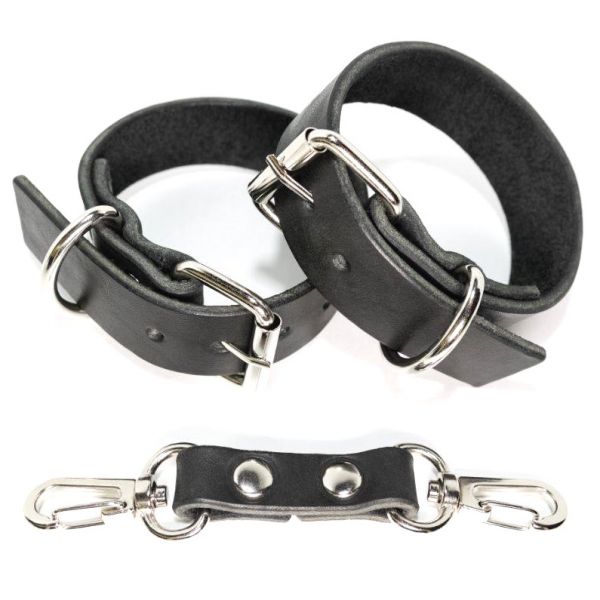 Наручники надежно фиксируются пряжками и ремнями, позволяющими выбрать нужный размер, кожаное соединение на карабинах фиксирует наручники вместе. Стильные наручники отлично подходят для воплощения эротических БДСМ игр.