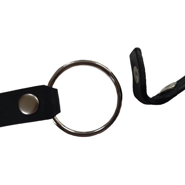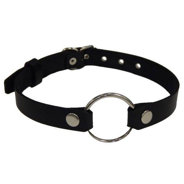 Кольцо держится на кожаных ремешках, которые крепятся на затылке, фиксируя кляп.