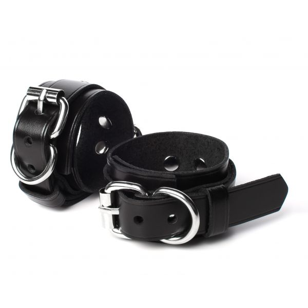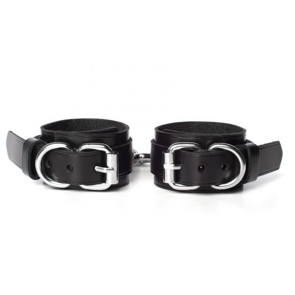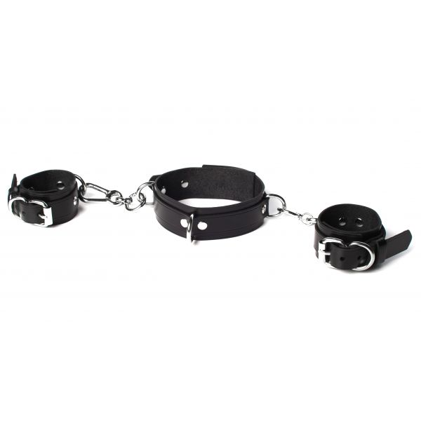 Металлическая фурнитура обеспечивает качественную фиксацию. Ошейник и наручники надежно крепятся пряжками, а длинные ремни позволяют подобрать нужный размер.