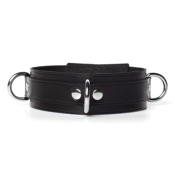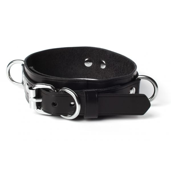 На ошейнике расположены 4 D-образных кольца. За них можно фиксировать как поводок, так и наручники.