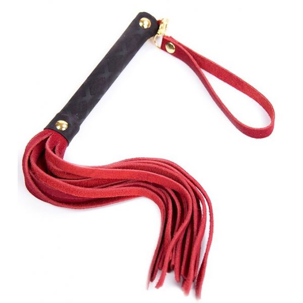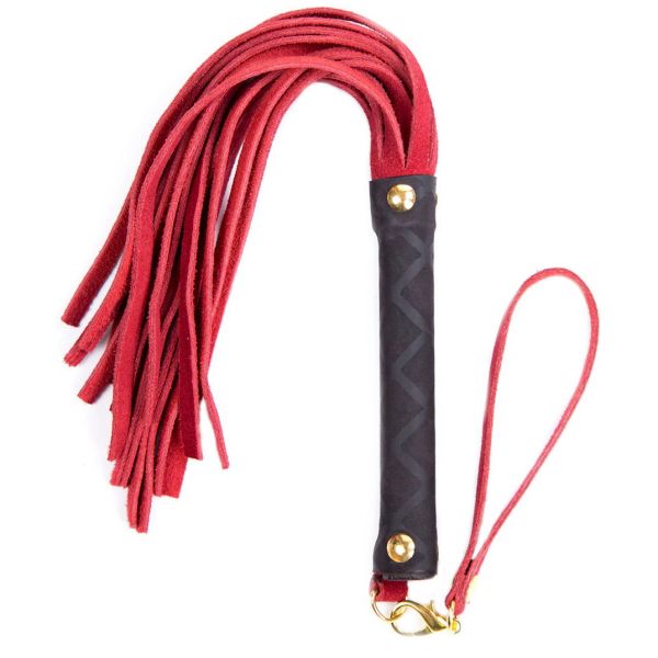 Сама плеть выполнена из красно-черной замши, ручка украшена квадратным узором. На конце имеется петелька красного цвета.