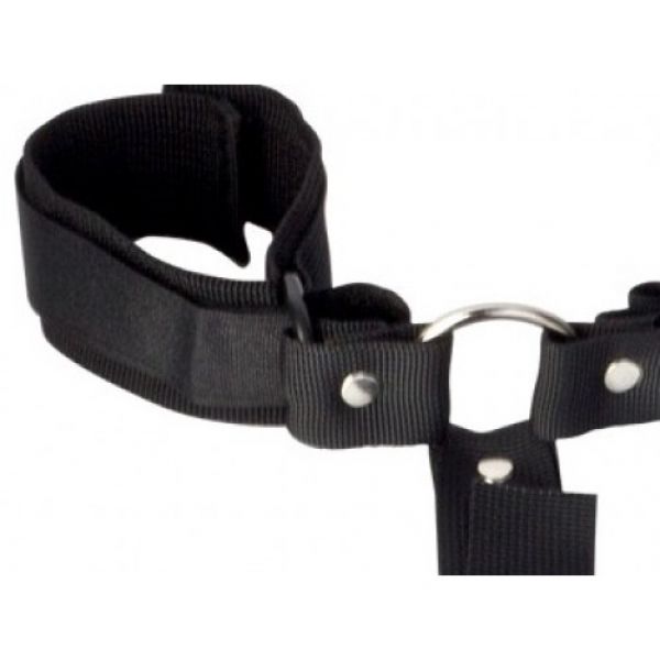 От ошейника на спине идет регулируемый ремень с фиксаторами. Ошейник и оковы фиксируются липучками.