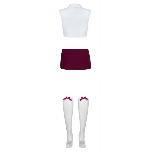 Костюм состоит из коротенькой бордовой юбочки, которая открывает соблазнительные ножки и делает акцент на бедрах. Верх представлен белым укороченным топом с полупрозрачными вставками, который привлекает все внимание к вашей груди. Комплект дополняют белые гетры с бордовыми бантиками и бордовые стринги, которые делают весь комплект более пикантным!