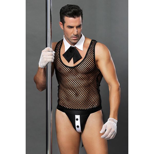 Майка с глубоким вырезом из крупной сетки подчеркивает рельеф грудной клетки. Воротник на кнопке, декорированный галстуком-бантом, расстегивается одним движением руки. Трусы-джоксы (с открытыми ягодицами) и откидывающимися фалдами на широких эластичных резинках делают образ незабываемым. Контрастный декор и пуговицы грамотно расставляют акценты. Сетчатые перчатки входят в комплект.