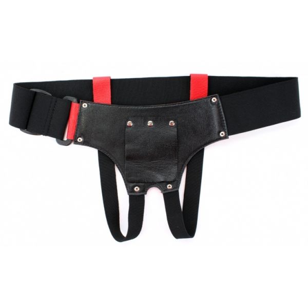 Трусики выполнены из натуральной кожи красного цвета с элементами из черных эластичных резинок, надежно фиксирующих изделие на теле.