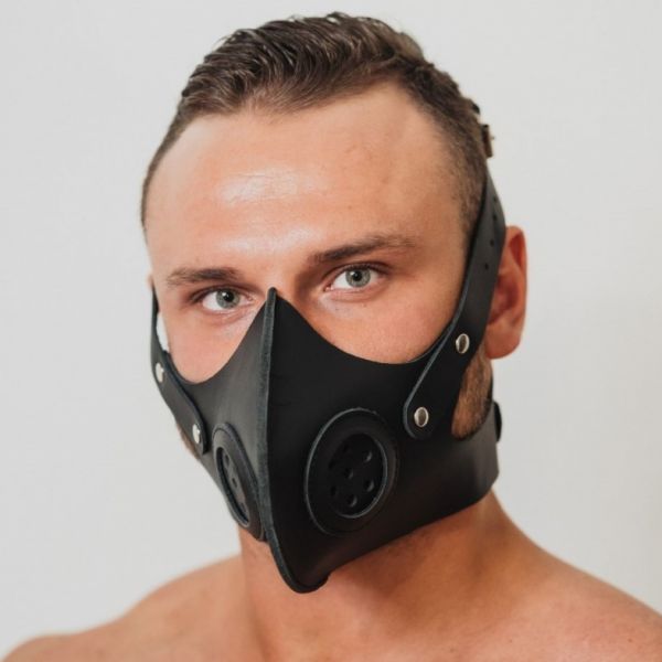 Маска из натуральной кожи черного цвета со вставками по бокам, напоминающими фильтры противогаза, придающие виду соответствующий антураж. Маска надежно фиксируется на голове, отлично подходит для продолжительных ролевых игр. Дерзкий дизайн поможет раскрыть все грани вашей роли в БДСМ игре.