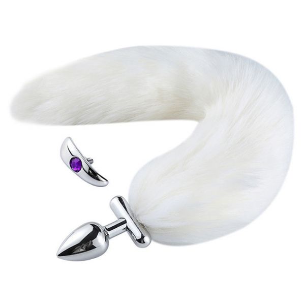 Металлическая анальная втулка со съемным белым хвостиком и пробкой с фиолетовым кристаллом