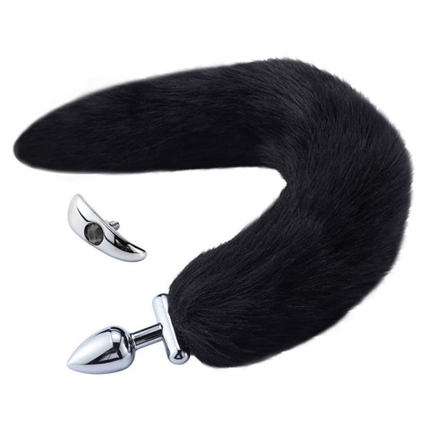 Металлическая анальная втулка со съемным черным хвостиком и пробкой с черным кристаллом