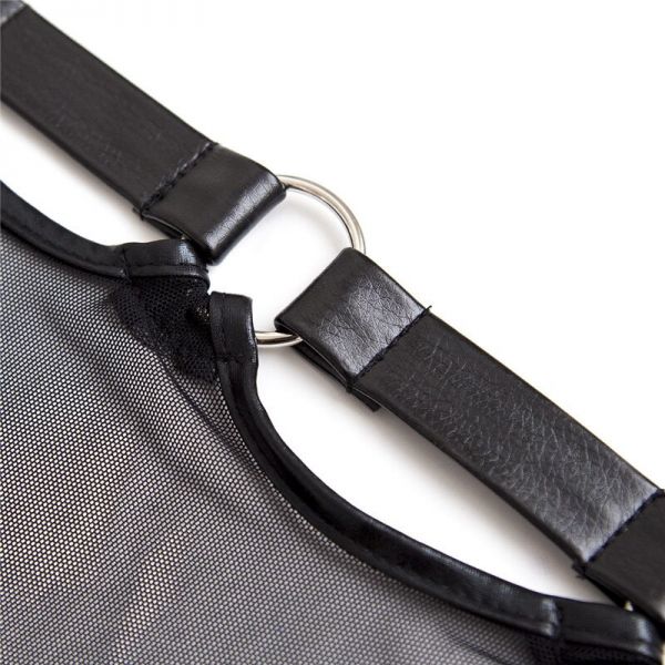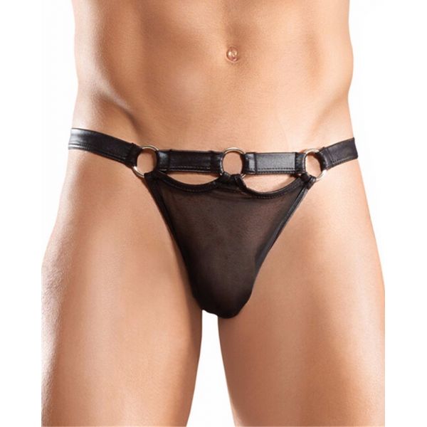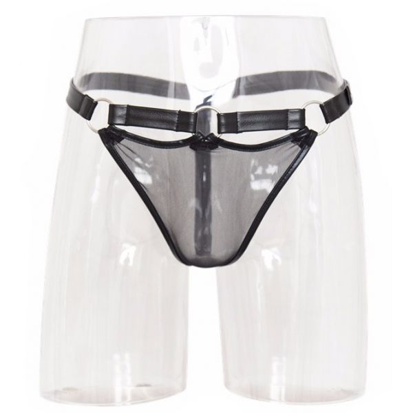 Эротические черные трусики-стринг выполнены из тонкой черной сеточки и искусственной кожи.
