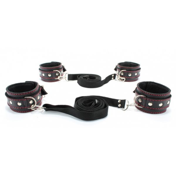 Набор для связывания состоит из наручников и оков, выполненных из натуральной черной кожи с контрастной красной строчкой, и двух бандажных ремней с карабинами.Аксессуары фиксируются на теле при помощи ремней и металлических пряжек. Наручники подойдут на обхват руки от 15 до 25см, оковы подойдут на обхват от 16 до 27см. Ширина оков и наручников 5см, ширина ремешков 2,5см.