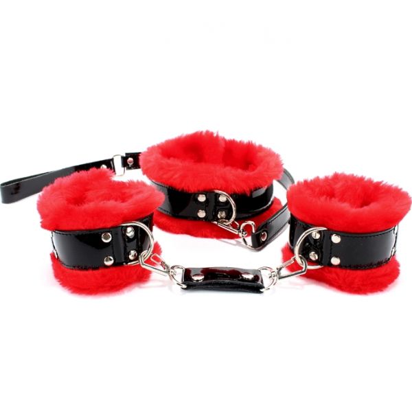 Набор фиксаторов (ошейник, поводок, оковы) из лакированной кожи с красным мехом