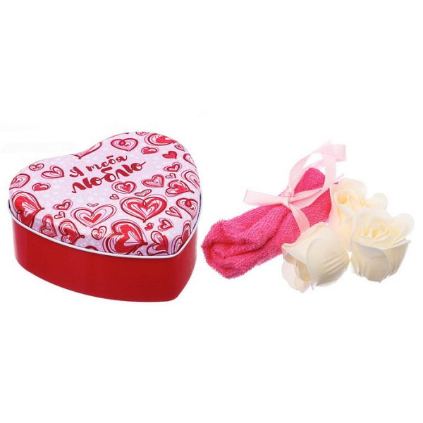 - В наборе 5 мыльных бутонов, полотенце и металлическая шкатулка, которую в дальнейшем можно использовать в качестве коробочки для хранения вещей.