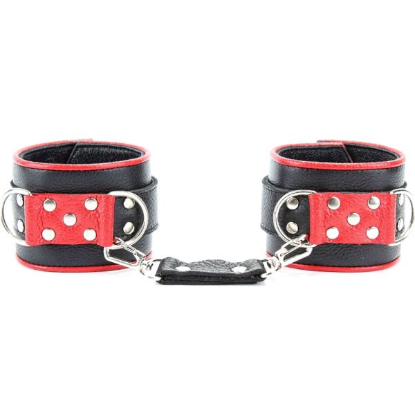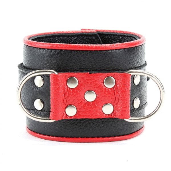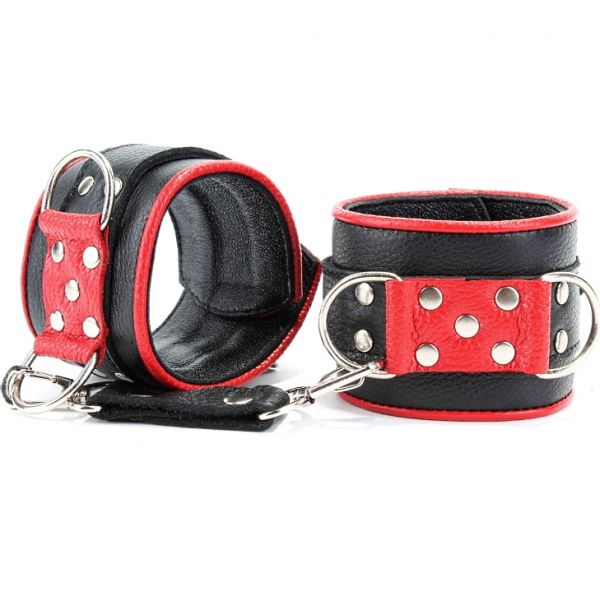 Наручники из натуральной кожи с окантовкой и двумя полукольцами черно-красные