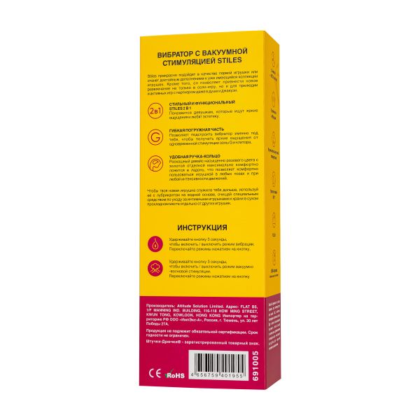 Стильный и функциональный Stiles 2 в 1 понравится девушкам, которые ищут яркие ощущения и любят эстетику. Нереалистичный вибратор с вакуумной стимуляцией Stiles имеет эргономичную форму и необычайно удобное ручку-кольцо, что позволяет комфортно пользоваться игрушкой в любых позах и при любой интенсивности движений. Гибкая погружная часть подстраивается именно под тебя, чтобы ты могла получать яркие ощущения от одновременной стимуляции зоны G и клитора. В твоем распоряжении 9 режимов вибрации, работающих отдельно от внешней части игрушки. Вакуум-волновой стимулятор бесконтактно воздействует непосредственно на клитор с помощью 9 режимов воздушных волн различной интенсивности. Используя одновременно два вида стимуляции ты воздействуешь на два мощнейших эпицентра женского оргазма, что непременно подарит тебе максимум удовольствия и по-новому откроет возможности твоего тела. Роскошный девайс насыщенно розового цвета и ручкой-кольцом с золотой отделкой максимально комфортно ложится в ладонь. Stiles прекрасно подойдет в качестве первой игрушки или станет достойным дополнением к уже имеющейся коллекции игрушек. Кроме того, Stiles позволяет привнести новое развлечение не только в соло-игру, но и для прелюдии и активных игр с партнером даже в душе и джакузи. Чтобы твоя новая игрушка служила тебе дольше, используй с лубрикантом на водной основе. Очищай специальным средством по уходу за интимными игрушками и храни в сухом прохладном месте отдельно от других игрушек. Заряжается Stiles магнитной зарядкой с USB-портом.