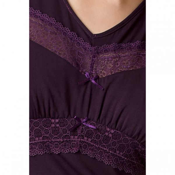 Коротенькая ночная сорочка с коротким рукавом от известного польского бренда Passion, выполненная из мягкой вискозы фиолетового цвета, отделанной изысканным итальянским кружевом. Небольшие разрезы по бокам сорочки декорированы маленькими бантиками.