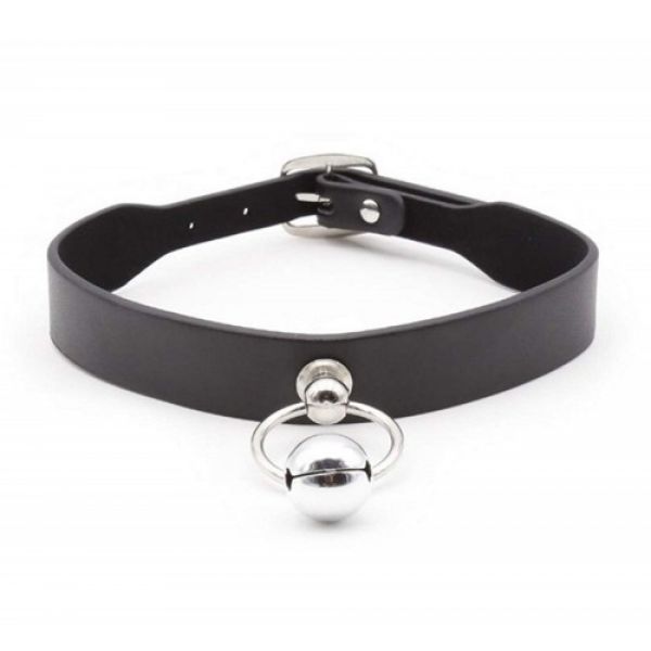 Оригинальный черный ошейник, декорированный колокольчиком. Крепление в виде застежки.
