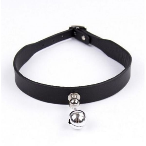 Оригинальный черный ошейник, декорированный колоколом. Крепление в виде застежки.