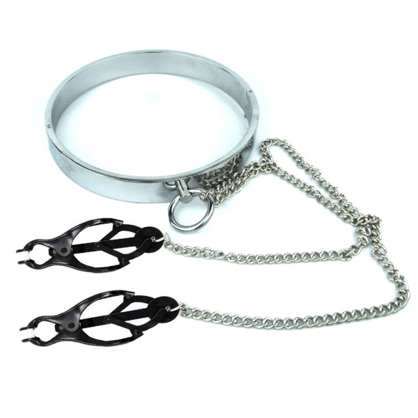 На ошейнике металлическое кольцо, от которого идут клипсы на соски в виде клевера, который двигается при разжатии. Кольцо это, при желании, можно легко открутить.
