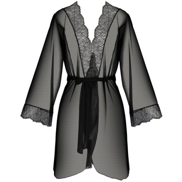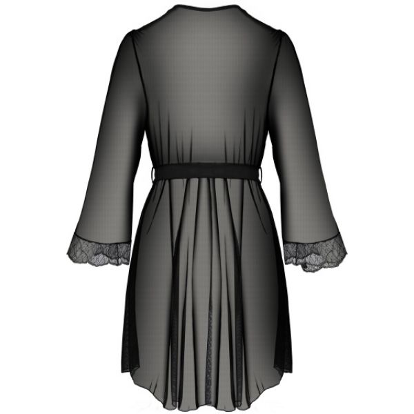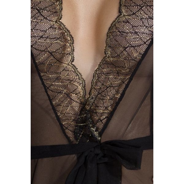 Роскошный пеньюар от польского бренда Passion, выполнено из мягкого полупрозрачного сетчатого полотна черного цвета и нежного кружева с золотистыми вкраплениями.