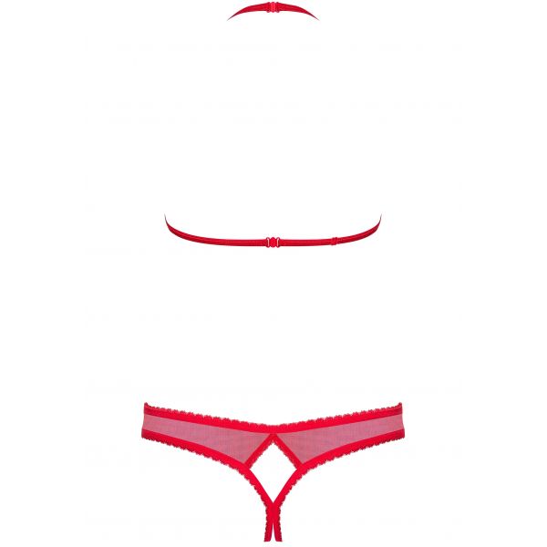 Детали: насыщенный красный цвет, сочетание полупрозрачной сеточки и кружева, открытый бюстгальтер с кружевом - добавит пикантности, небольшой пуш-ап для лучшей поддержки груди, регулируемые бретели и застежка на спине - Did2Fit - гарантия идеальной посадки, застежка на шее, декор в виде бантиков и маленьких блестящих камушков, трусики-стринги с открытой промежностью - залог острых ощущений и красивого вида ягодиц, эластичная и мягкая ткань Multistretch.