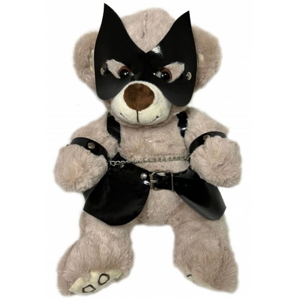 В лаковой портупее, маске и наручниках - такая игрушка станет интересной идеей для подарка или просто ярким элементом в интерьере.