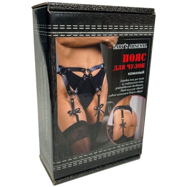 Утонченный и сексуальный кожаный пояс для чулок, выполнен в черном цвете, декорирован металлическими кольцами и бантиками, которые эффектно подчеркивают фигуру и создают эротичный, соблазнительный образ.