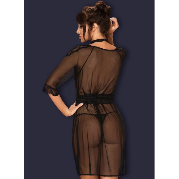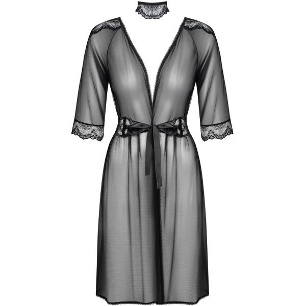 Комплект включает в себя пеньюар, чокер и кружевной пояс.