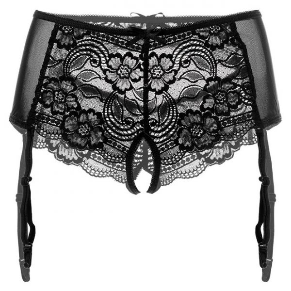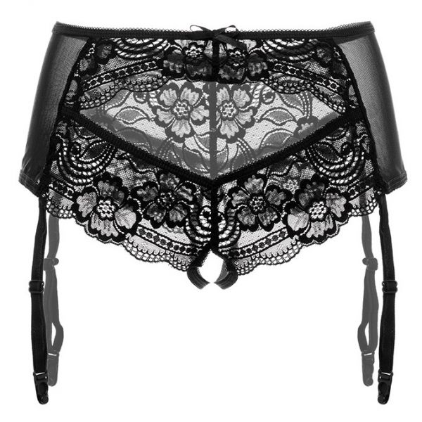 Эротические трусики-пояс Erolanta Sheila, эластичные, из стрейч-сетки со сложными кружевными вставками, с вырезом сзади, без боковых швов, с атласными бантиками. Съемные регулируемые пажи.